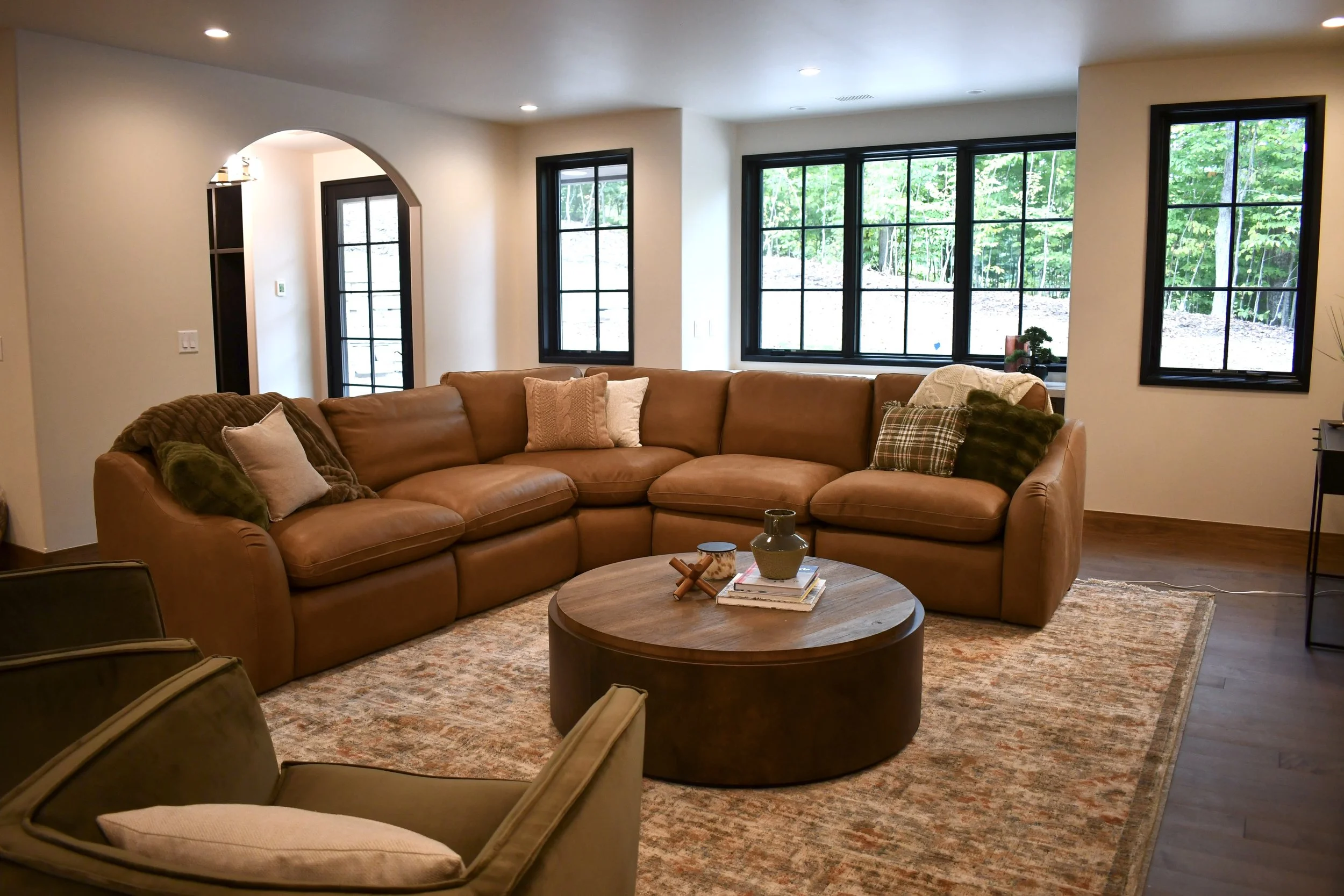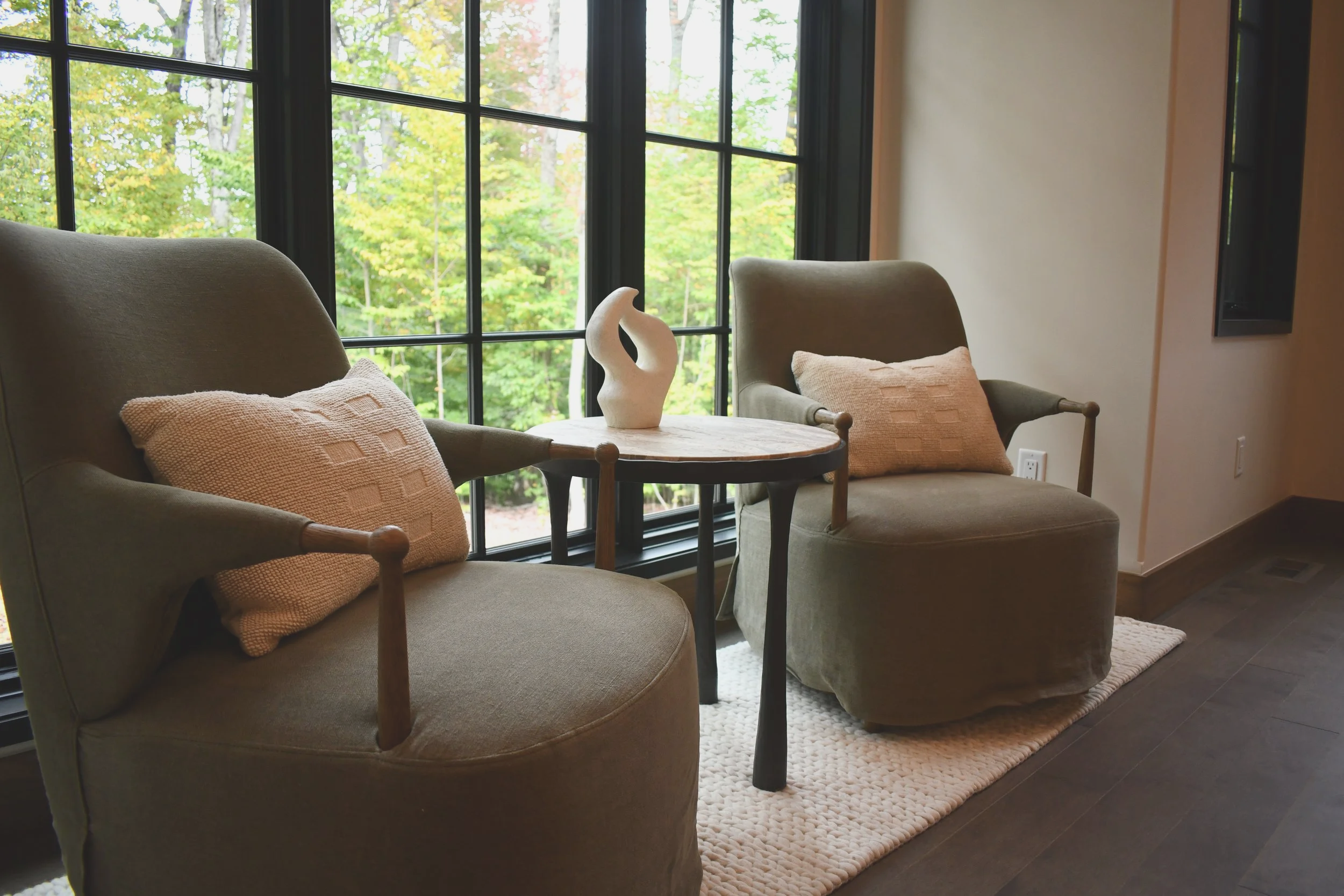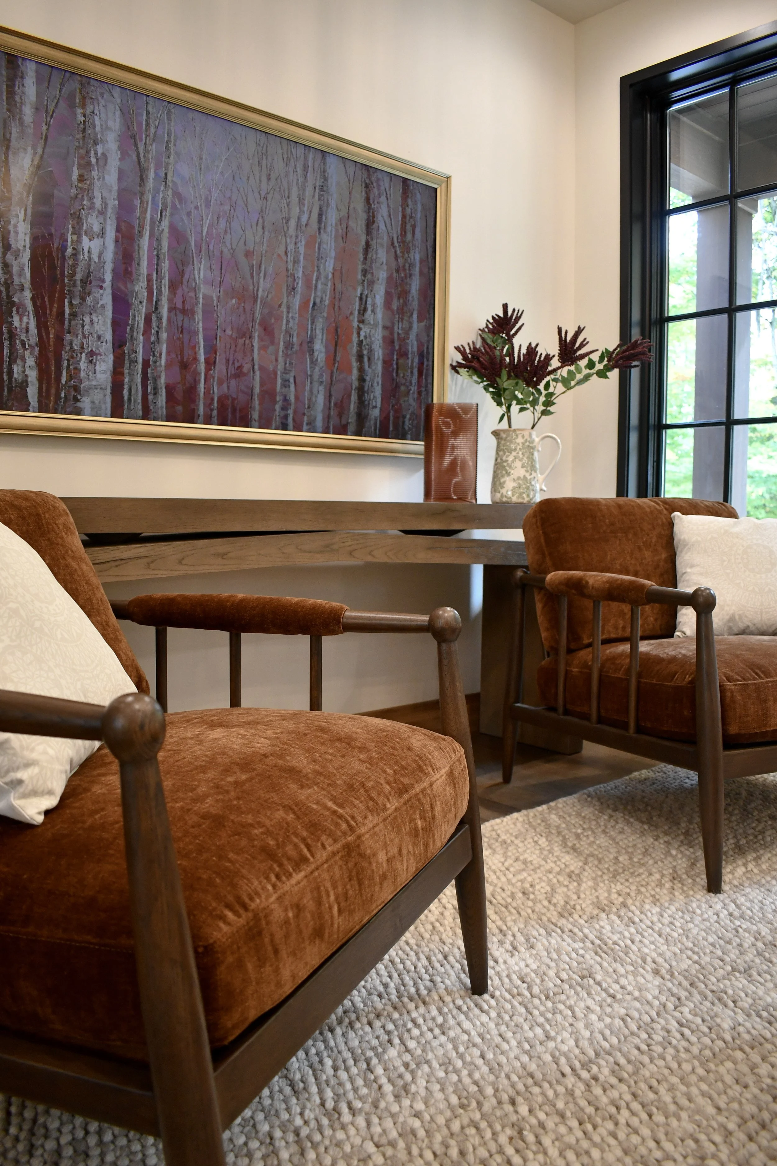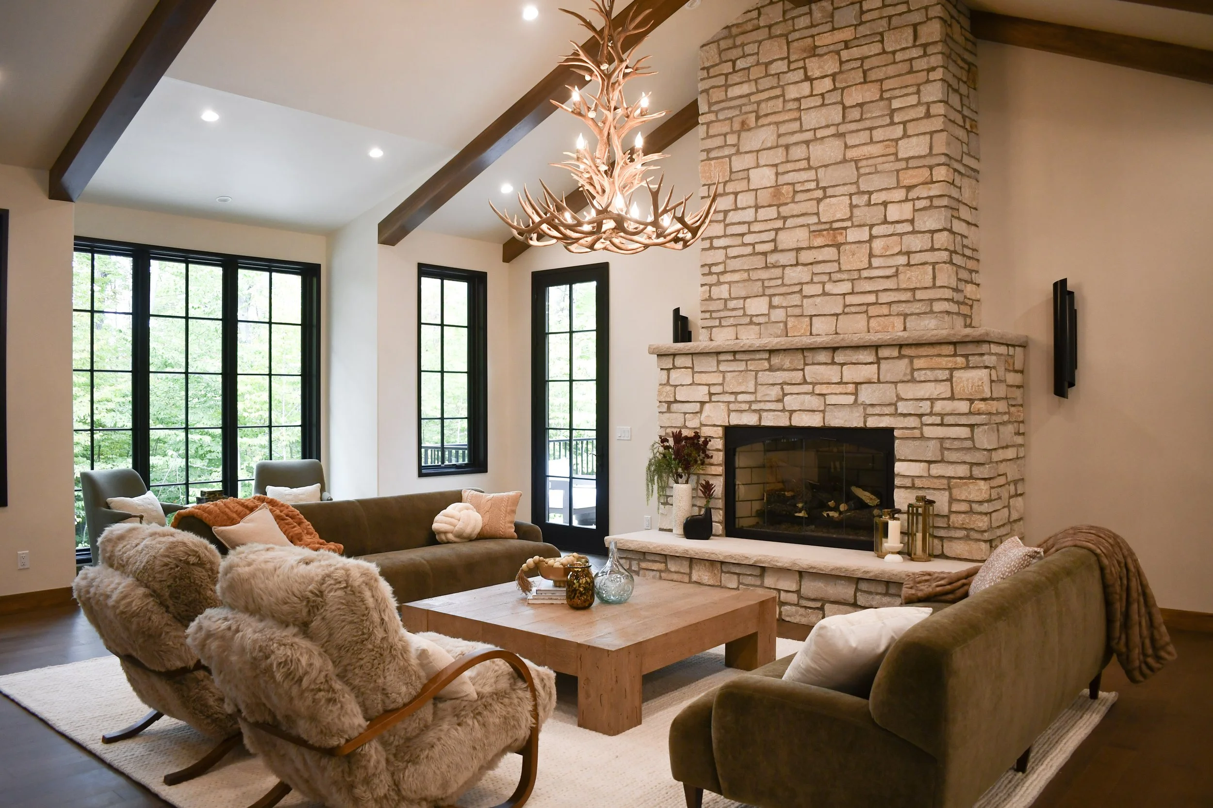 We layered rich textures, hand-finished wood tones, and natural materials that reflect the northern Michigan landscape. The palette — soft taupes, warm browns, and subtle greens — feels both grounded and elevated, echoing the woods and snow-covered hills just outside.